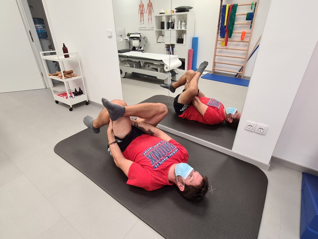 Početna pozicija kao u prethodnoj vježbi. Rukama obuhvatimo stražnji dio koljena i povučemo koljeno prema prsima dok ne osjetimo snažno istezanje u sredini stražnjice – prekrižene noge. Zadržimo 30 sekundi, postupno približavajući koljeno sebi za bolje istezanje. Postupno, zbog većeg približavanja koljena ponovimo istezanje 3x – „svaki puta malo više“ do granice izdržljivosti.