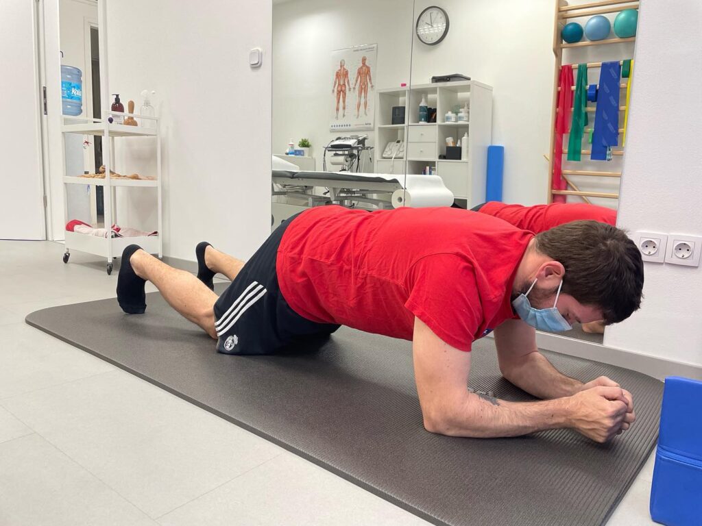 Napnemo mišiće trbušno lumbalne regije (core), tako da stvorimo otpor kao da želimo približiti laktove i koljena bez pokreta. Za vrijeme aktivacije mišića ramena ne podižemo u smjeru gore prema ušima.