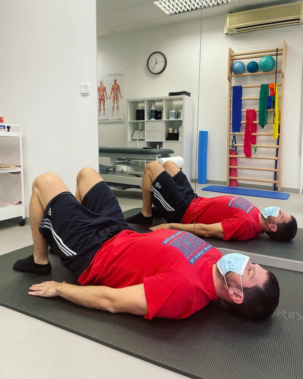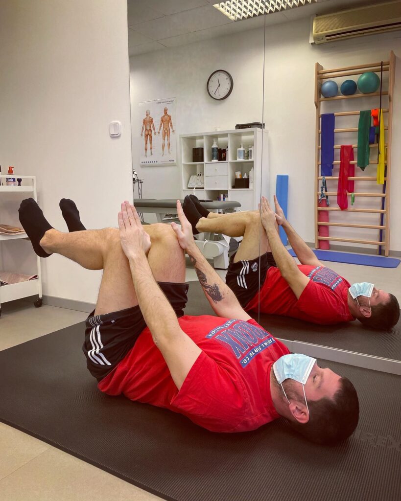 Predstavlja napredni oblik vježbe “jednostrani potisak abdomena”(A) ležimo na leđima sa savijenim koljenima i kralježnicom u neutralnoj poziciji. Nakašljemo se i zadržimo poziciju kako bi aktivirali mišić transversus abdominis (poprečni trbušni mišić). Podignemo jednu po jednu nogu i oslonimo danove iznad koljena.